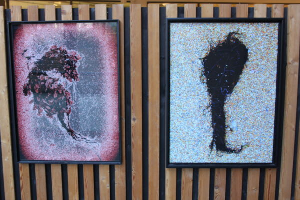 Nach dem Haupteingang fällt ein großes Bild mit Kunstbuchstaben des Gedichts „Liedermacher“ von Vogel ins Auge, vor dem Tafeln mit Selbstporträts einen Bezug zur Posie herstellen. Die ausdrucksvolle Mimik der einzelnen Bilder wirkt wie ein Kommentar. Das „Lettering“ ist wie die Kalligrafie eine alte Kunst, Buchstaben zu malen, zu drucken oder mit Schablonen kreativ zu gestalten. Zum Kontext gehören die bunten Hohenloher Landschaftsbilder mit Wiesen, Rindern und Stadtbilder von Schwäbisch Hall, die um die Sitzgruppe des Cafes BioRitter gruppiert sind.