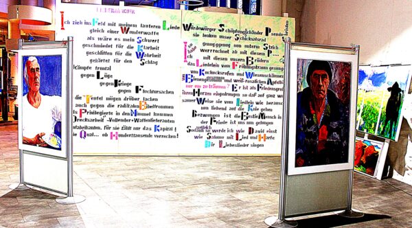 Roland Vogel zeigt Landschaften, Selbstporträts und Schriftkunst des Gedichts Liedermacher
